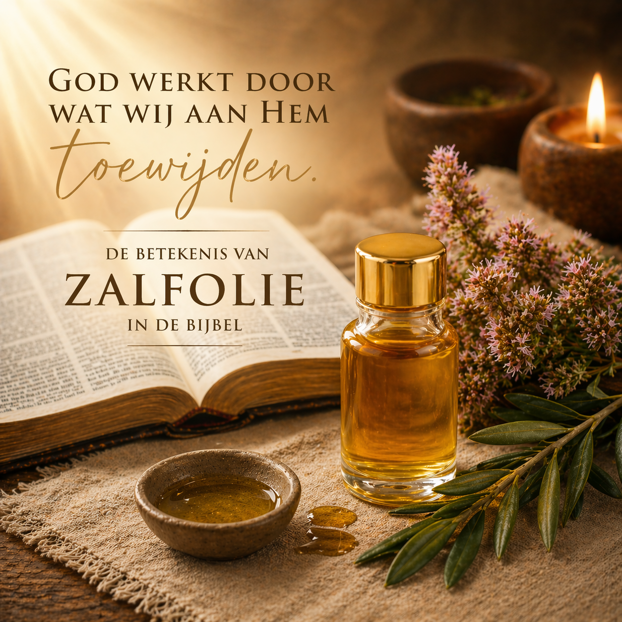 Door de hele Bijbel heen zien we een bijzonder patroon: God gebruikt vaak gewone dingen om Zijn werk zichtbaar te maken. Hij neemt iets eenvoudigs, zet het apart voor Zichzelf en maakt het tot een middel waardoor Zijn aanwezigheid en kracht zichtbaar worden. Dat zien we op een krachtige manier terug in zalfolie.